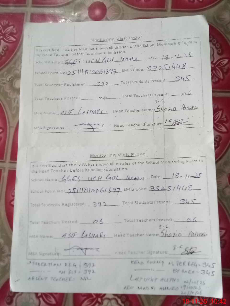 | Attendance Register | Head Teacher | MEA with School | Visit Proof |