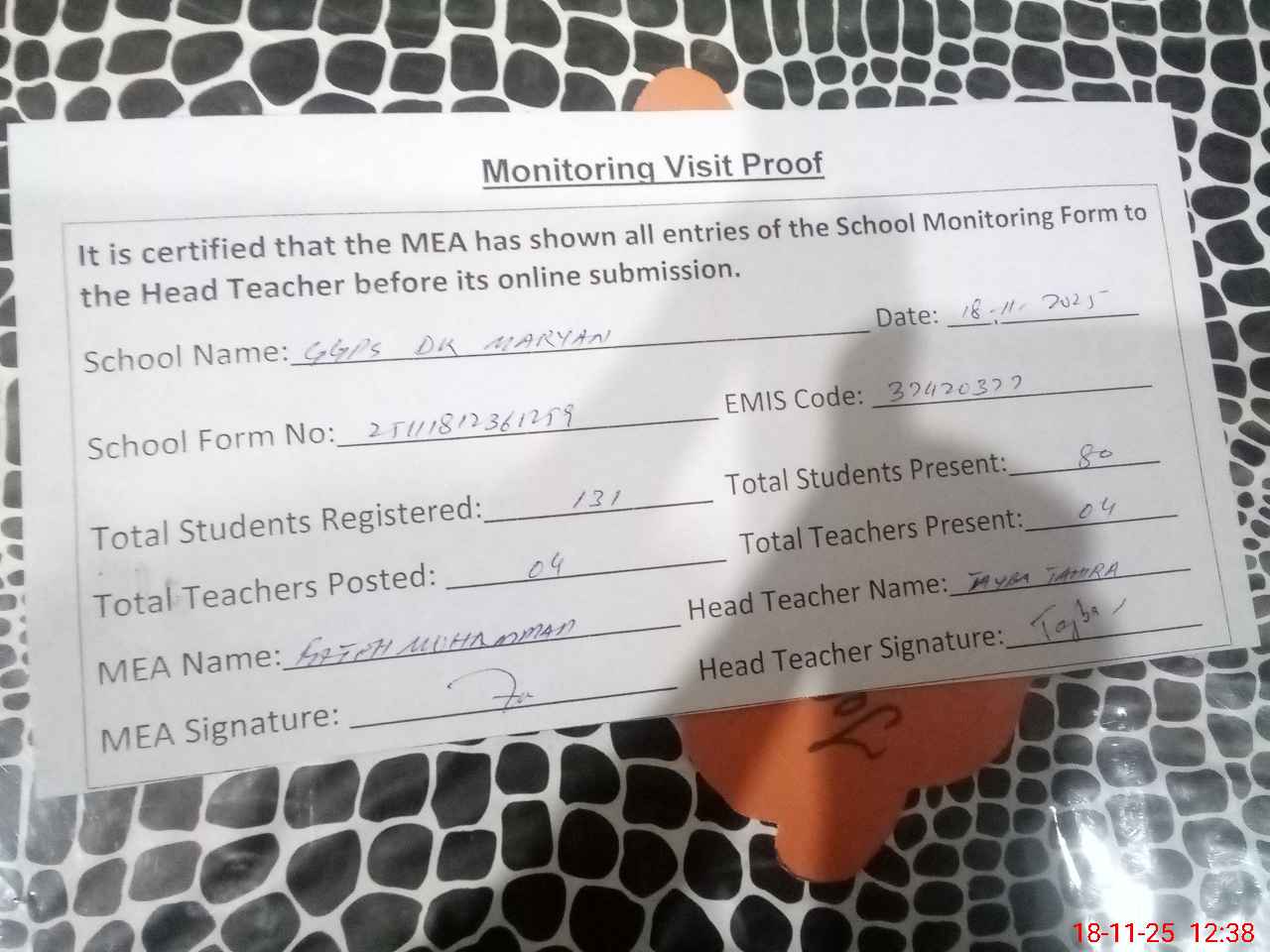 | Attendance Register | Head Teacher | MEA with School | Visit Proof |