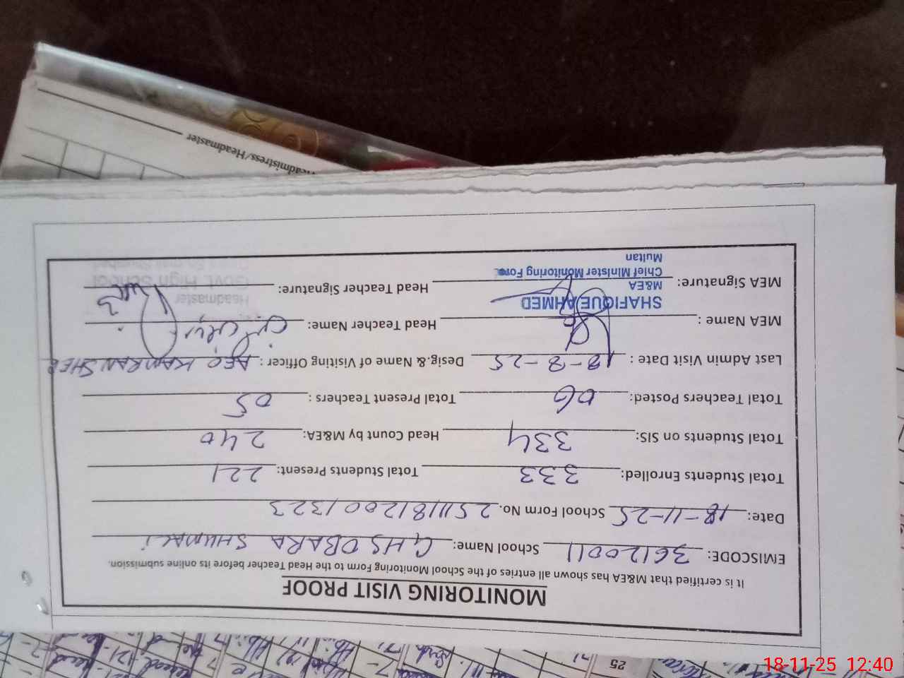 | Certified that this School was Inspected by the Undersigned MEA/DMO Today and the Information Stated Above is as Per Record. | |||||