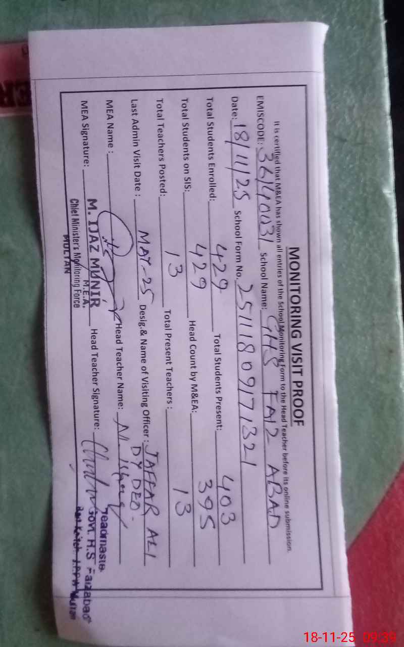 | EMIS Code: 36140031 | Name of School: GHS FAIZ ABAD P/O BAIT KATCH | |||