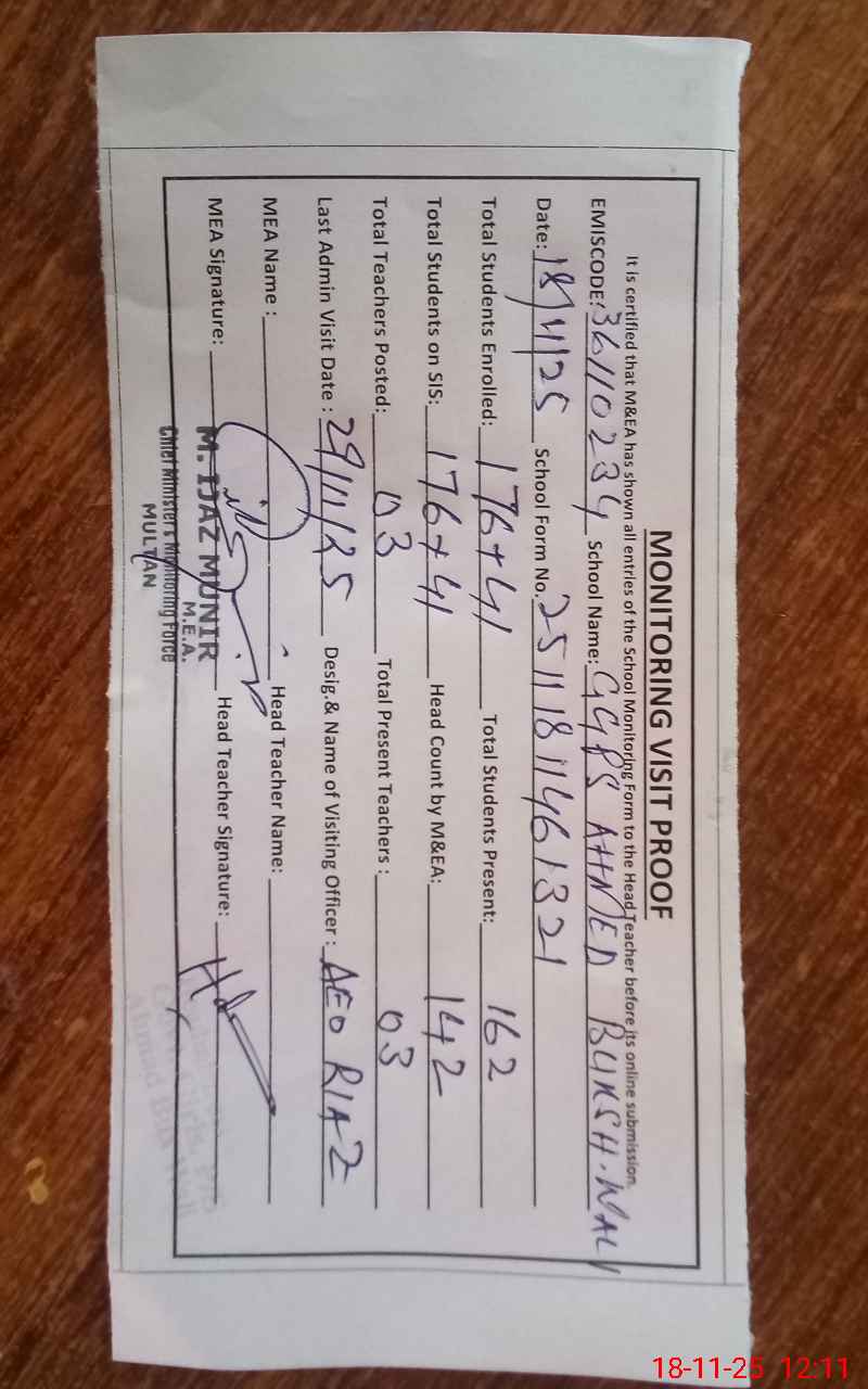 | Attendance Register | Head Teacher | MEA with School | Visit Proof |