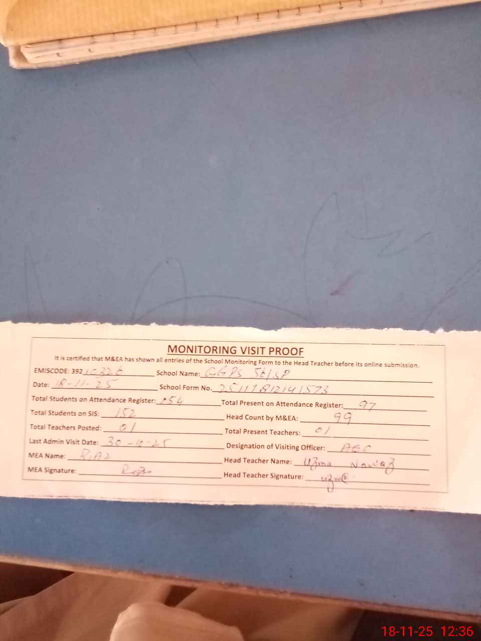 | Attendance Register | Head Teacher | MEA with School | Visit Proof |