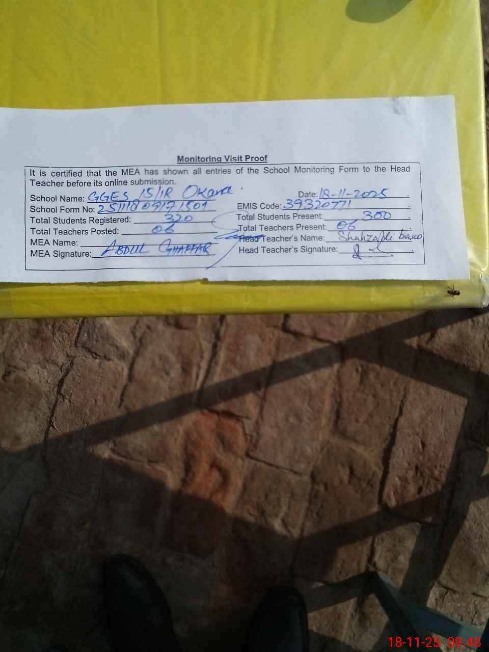 | Attendance Register | Head Teacher | MEA with School | Visit Proof |
