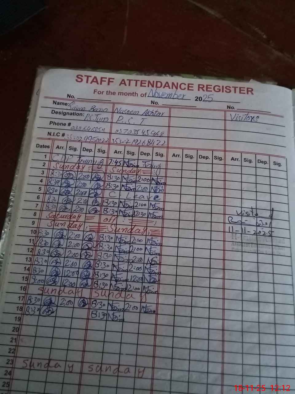 | CNIC | Full Name | Designation | R/C | Absence During Last Calender Month |