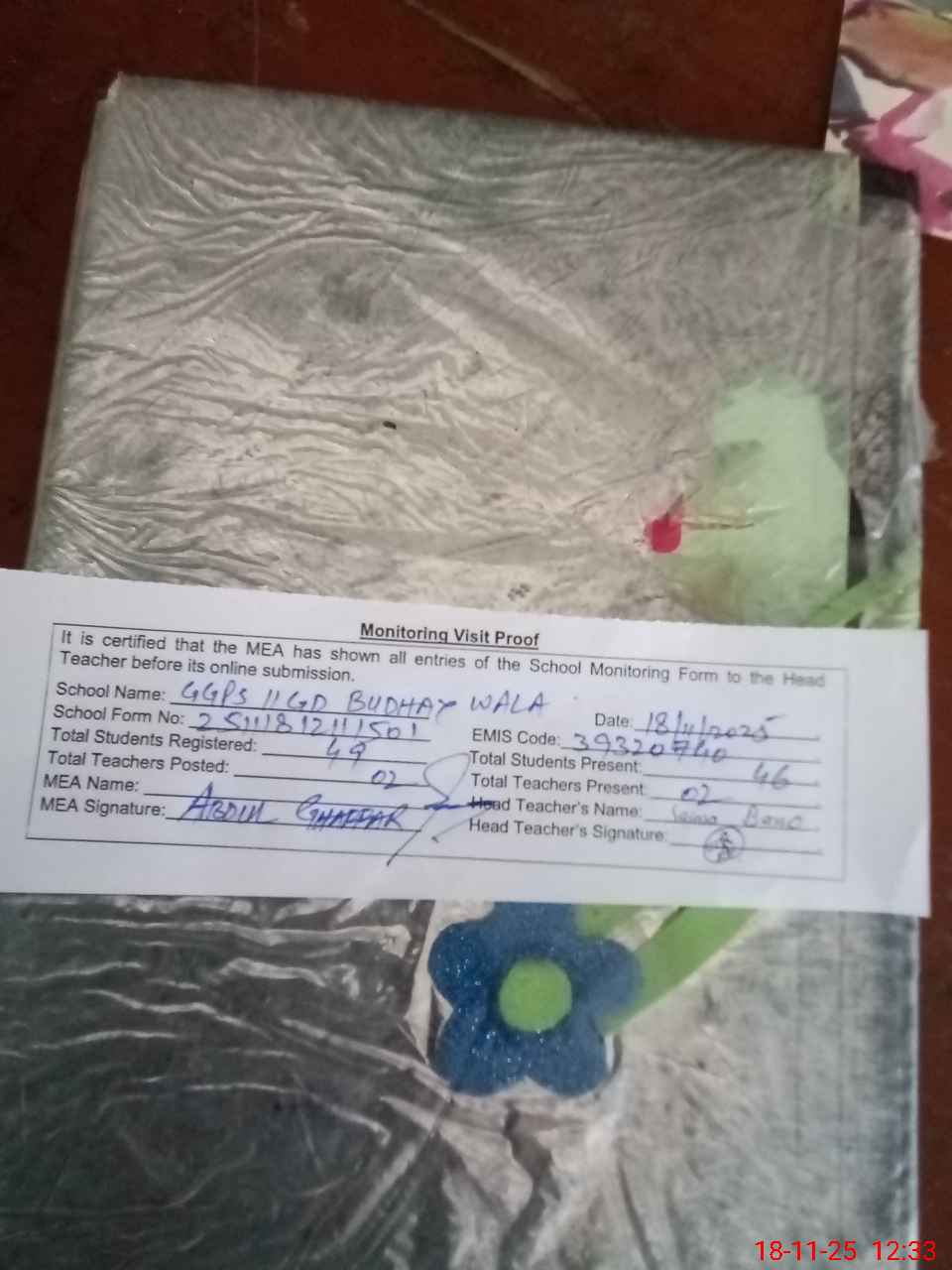| Attendance Register | Head Teacher | MEA with School | Visit Proof |