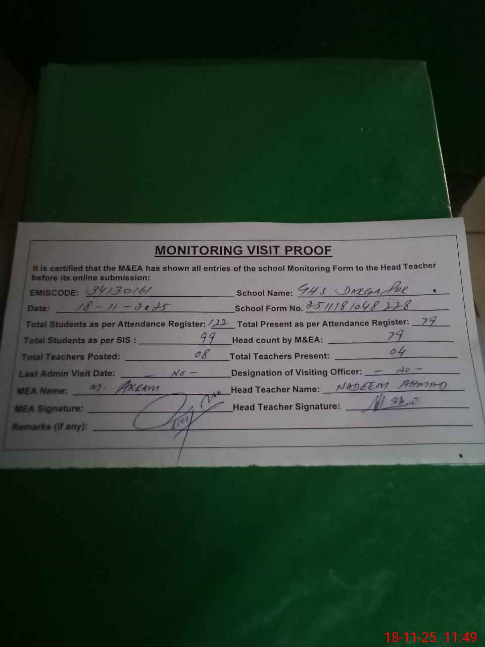 | Attendance Register | Head Teacher | MEA with School | Visit Proof |