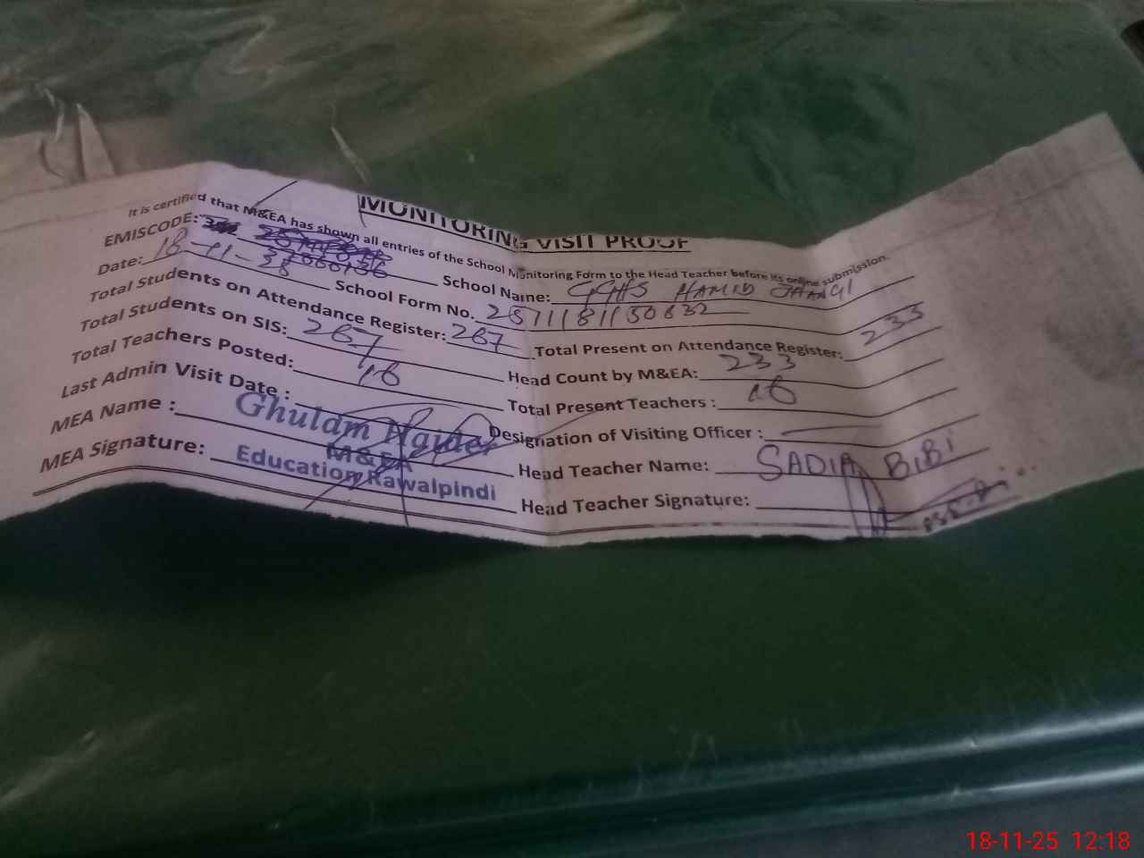 | Attendance Register | Head Teacher | MEA with School | Visit Proof |