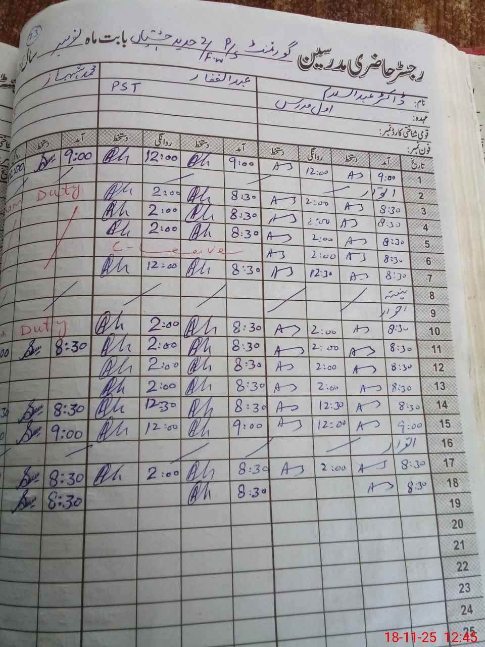 | CNIC | Full Name | Designation | R/C | Absence During Last Calender Month |