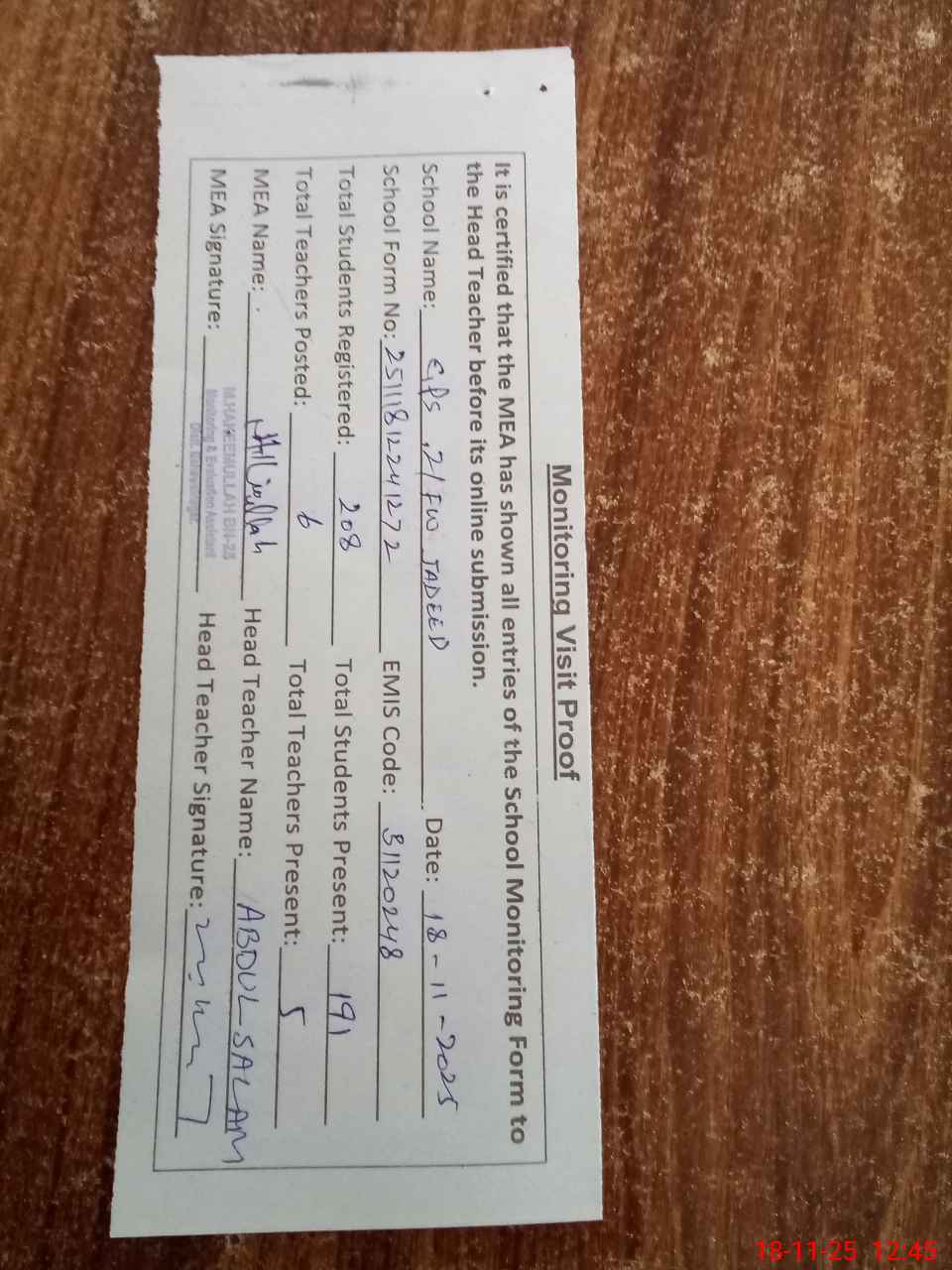 | Attendance Register | Head Teacher | MEA with School | Visit Proof |