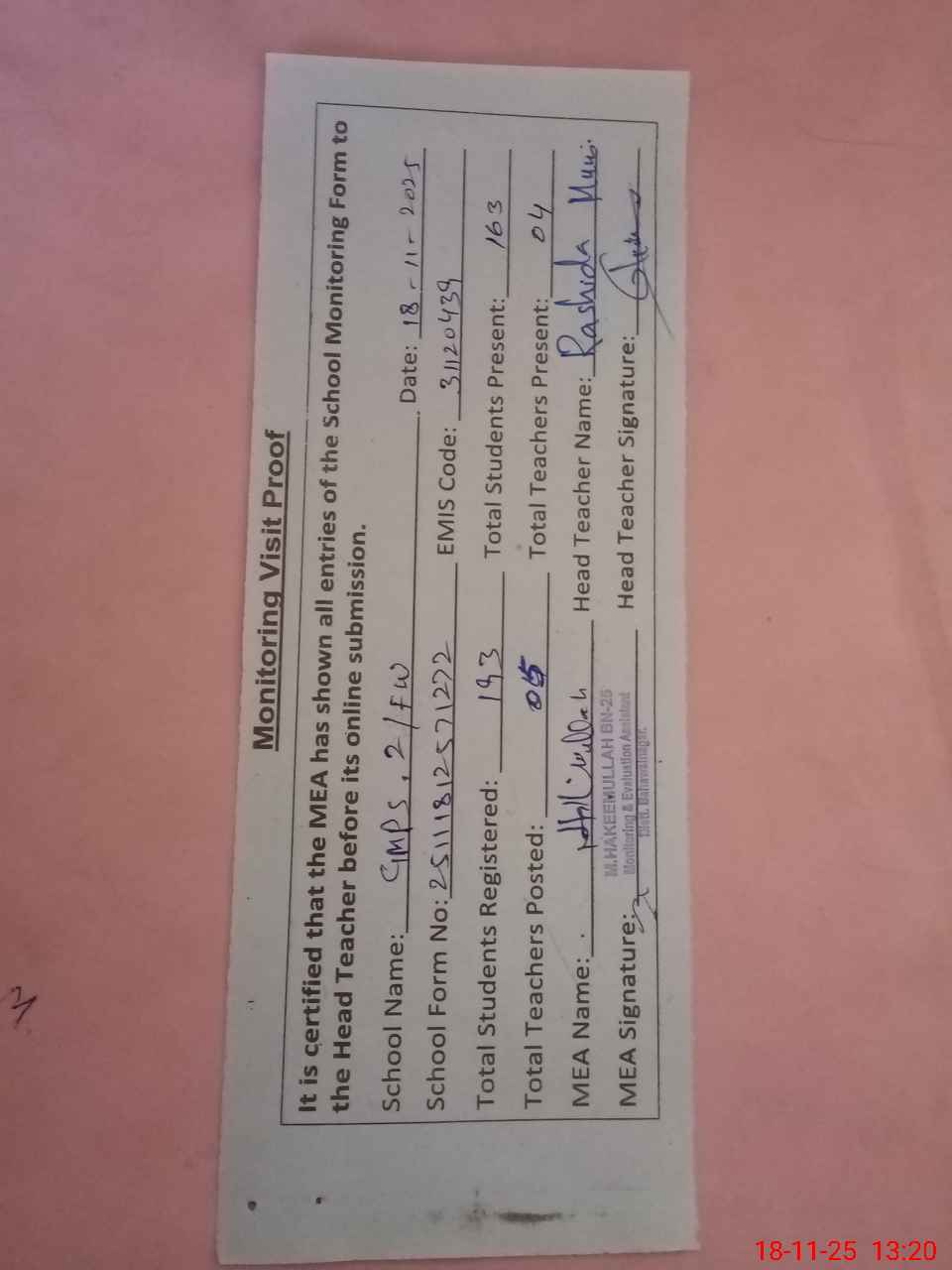 | Attendance Register | Head Teacher | MEA with School | Visit Proof |