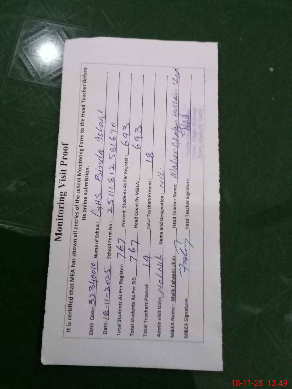 | Attendance Register | Head Teacher | MEA with School | Visit Proof |