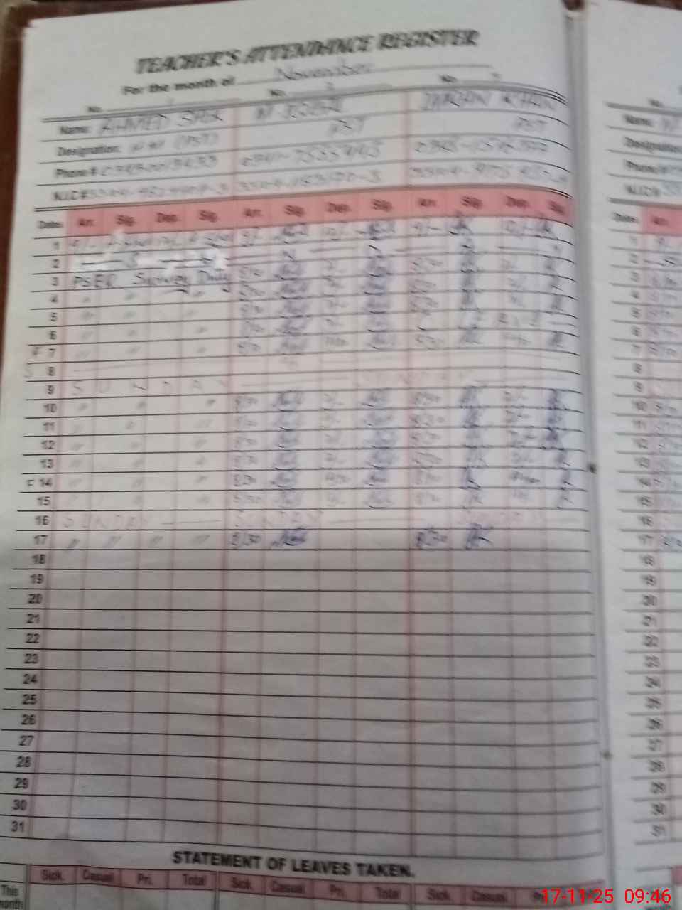 | CNIC | Full Name | Designation | R/C | Absence During Last Calender Month |
