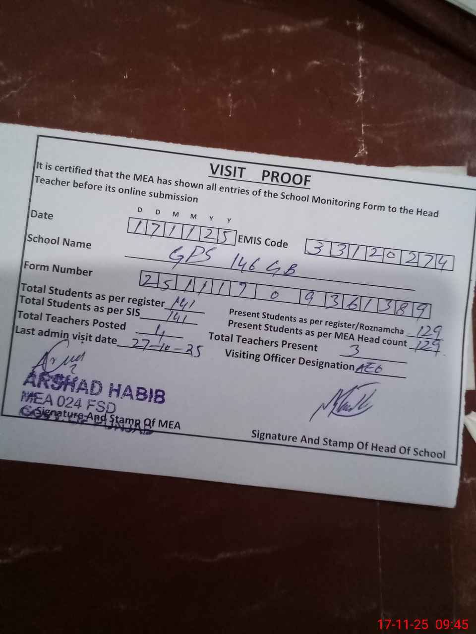 | Attendance Register | Head Teacher | MEA with School | Visit Proof |