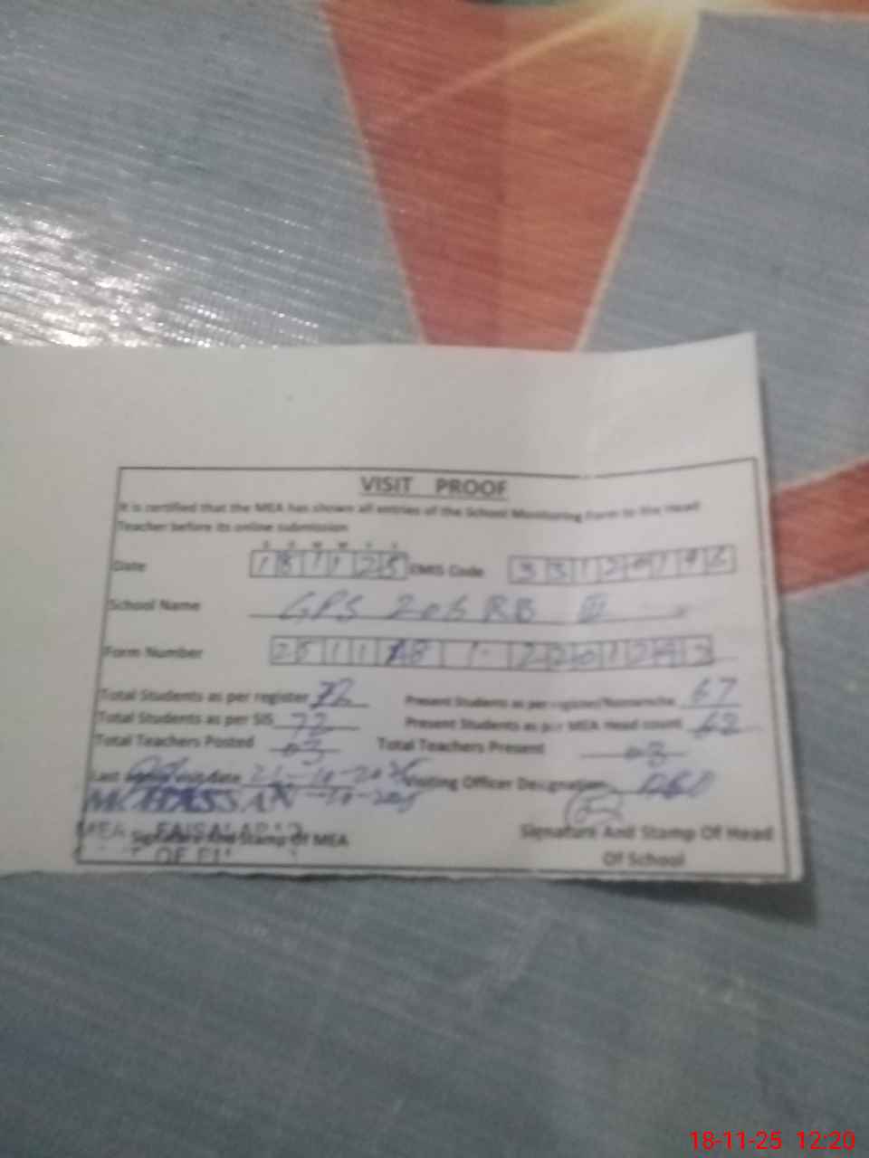 | Attendance Register | Head Teacher | MEA with School | Visit Proof |