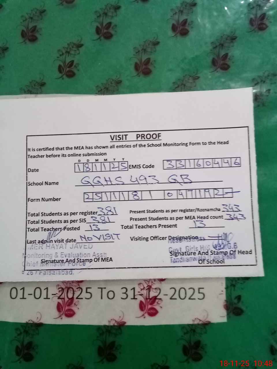 | EMIS Code: 33160446 | Name of School: GGHS CHAK NO 493 GB FSD | |||