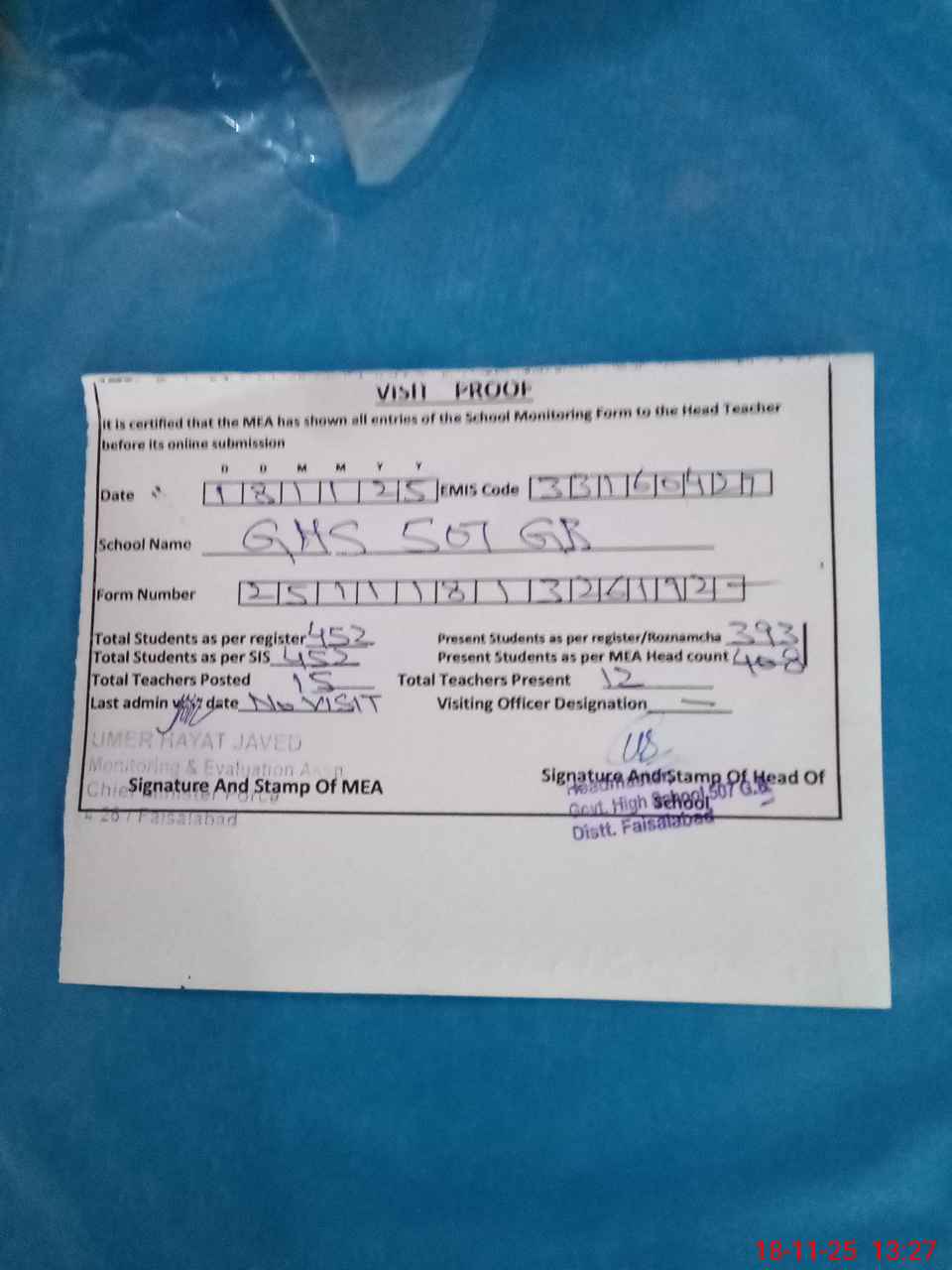 | Attendance Register | Head Teacher | MEA with School | Visit Proof |