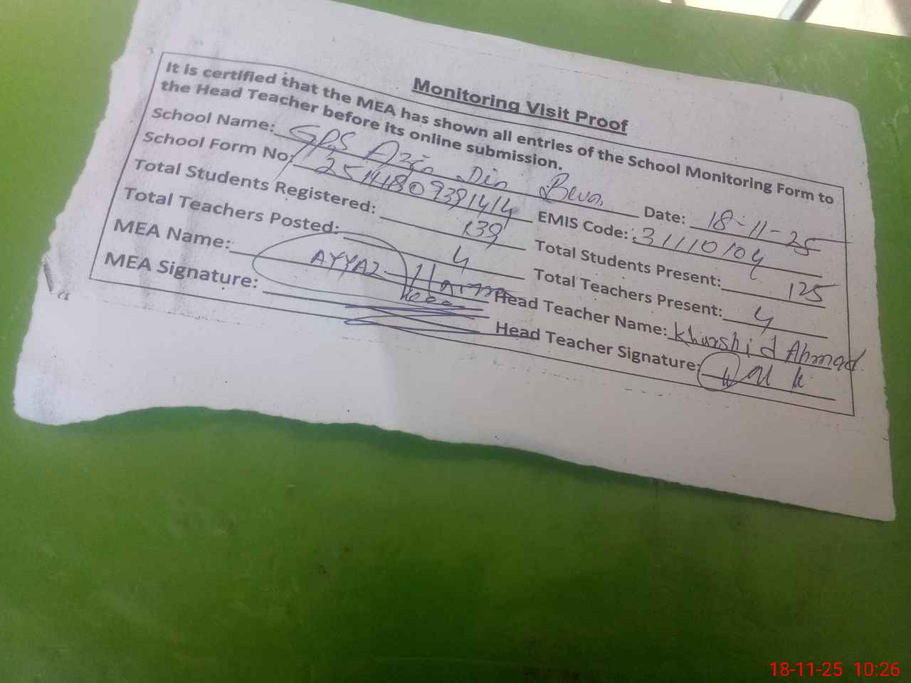 | EMIS Code: 31110104 | Name of School: GPS AZIZ DIN | |||