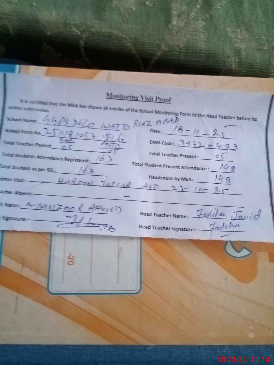 | Attendance Register | Head Teacher | MEA with School | Visit Proof |