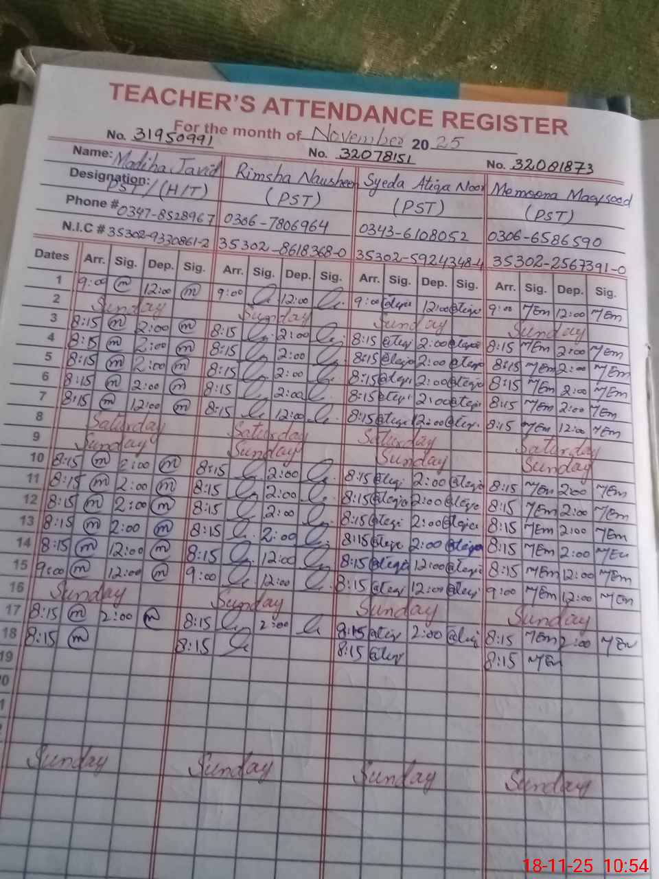 | CNIC | Full Name | Designation | R/C | Absence During Last Calender Month |