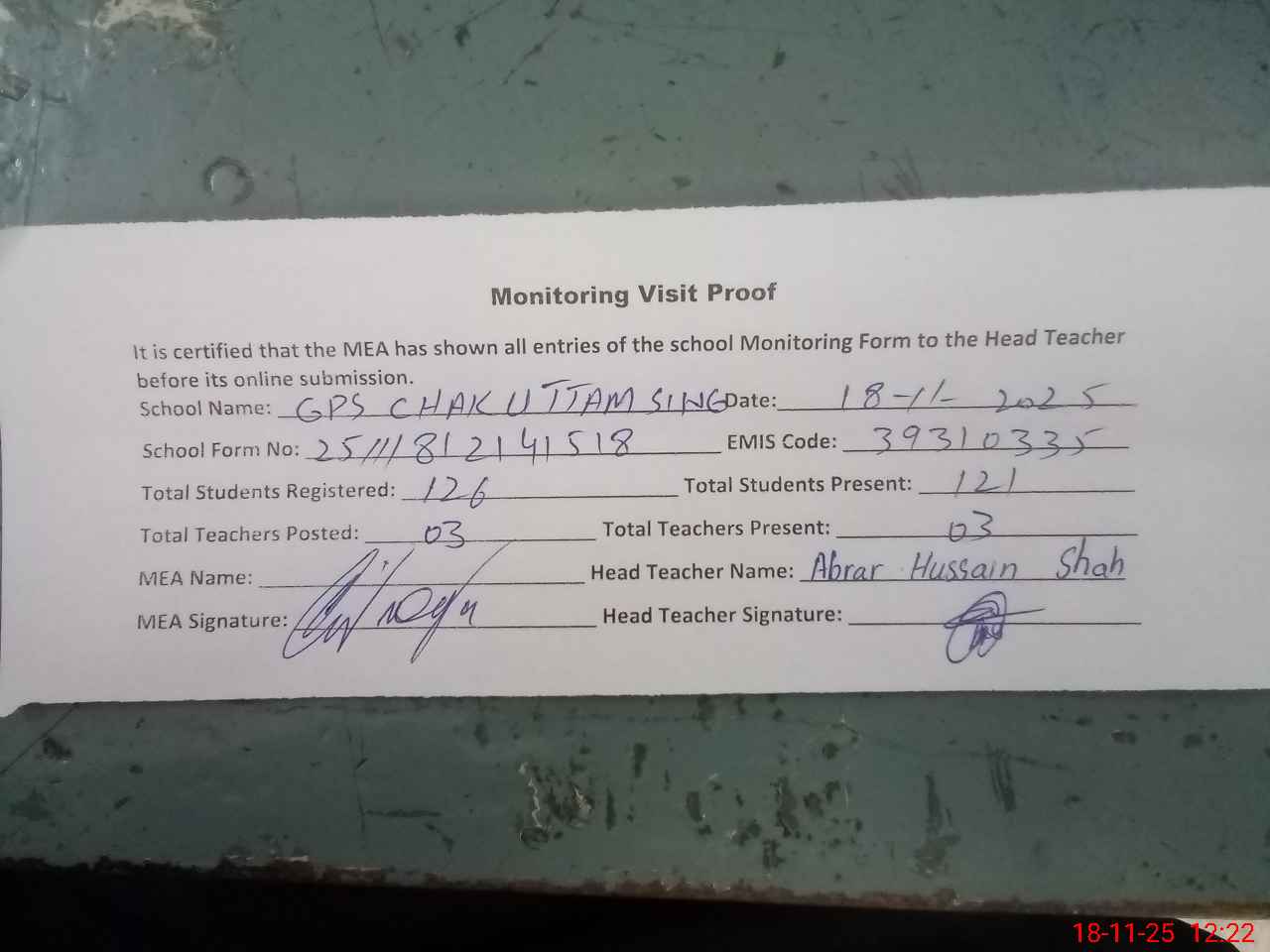 | Attendance Register | Head Teacher | MEA with School | Visit Proof |
