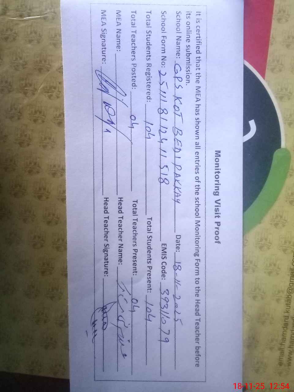 | Attendance Register | Head Teacher | MEA with School | Visit Proof |