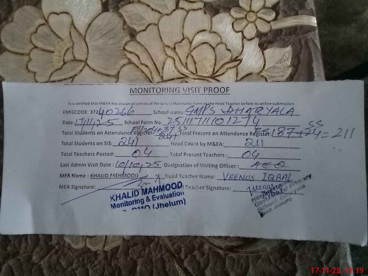 | EMIS Code: 37240266 | Name of School: GMPS DHARYALA | |||