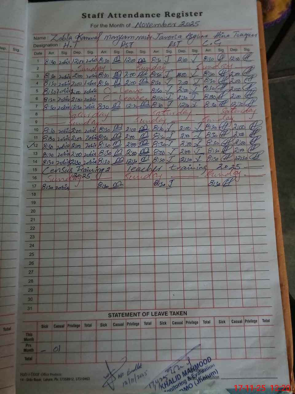 | CNIC | Full Name | Designation | R/C | Absence During Last Calender Month |
