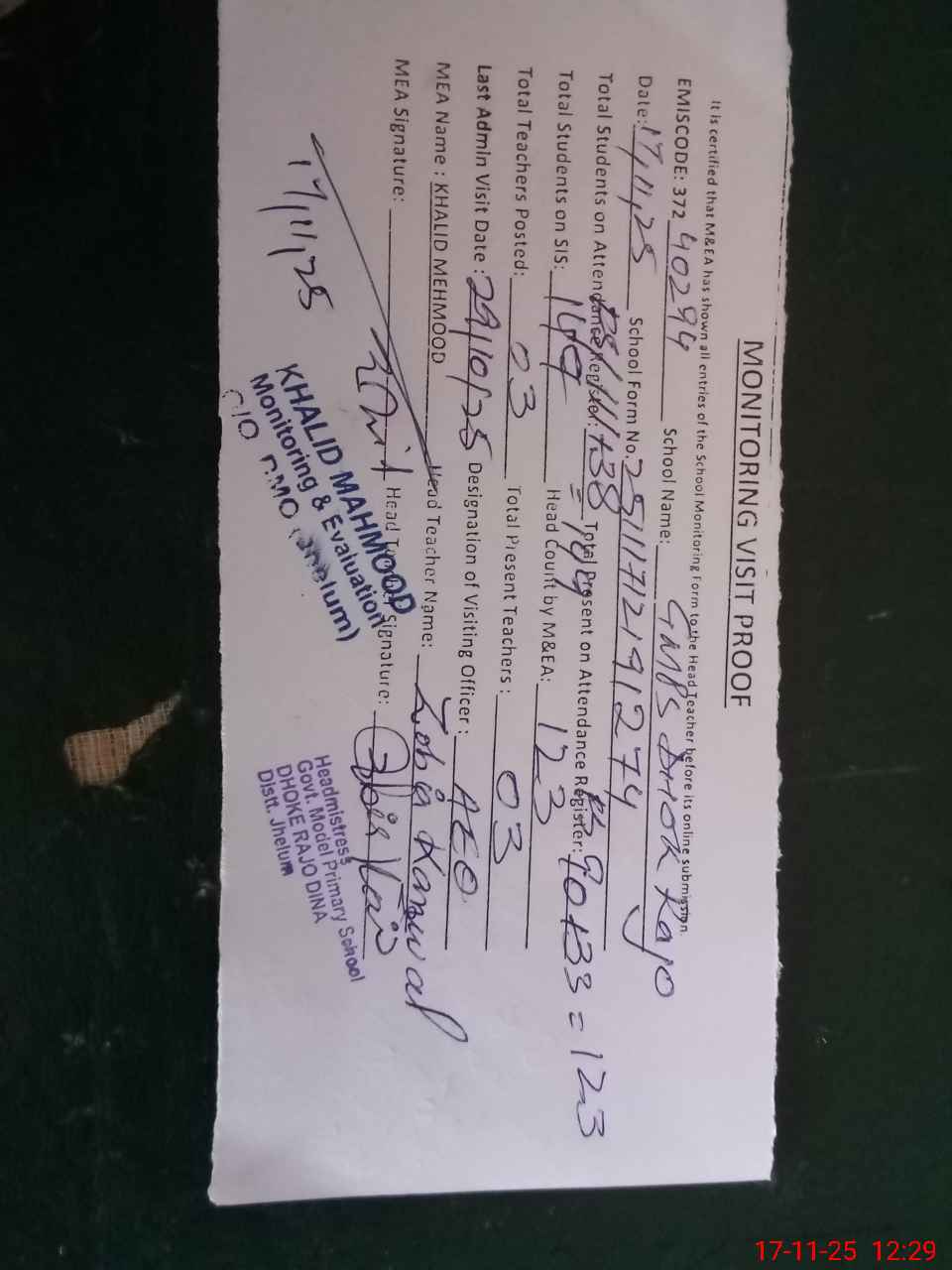 | Attendance Register | Head Teacher | MEA with School | Visit Proof |
