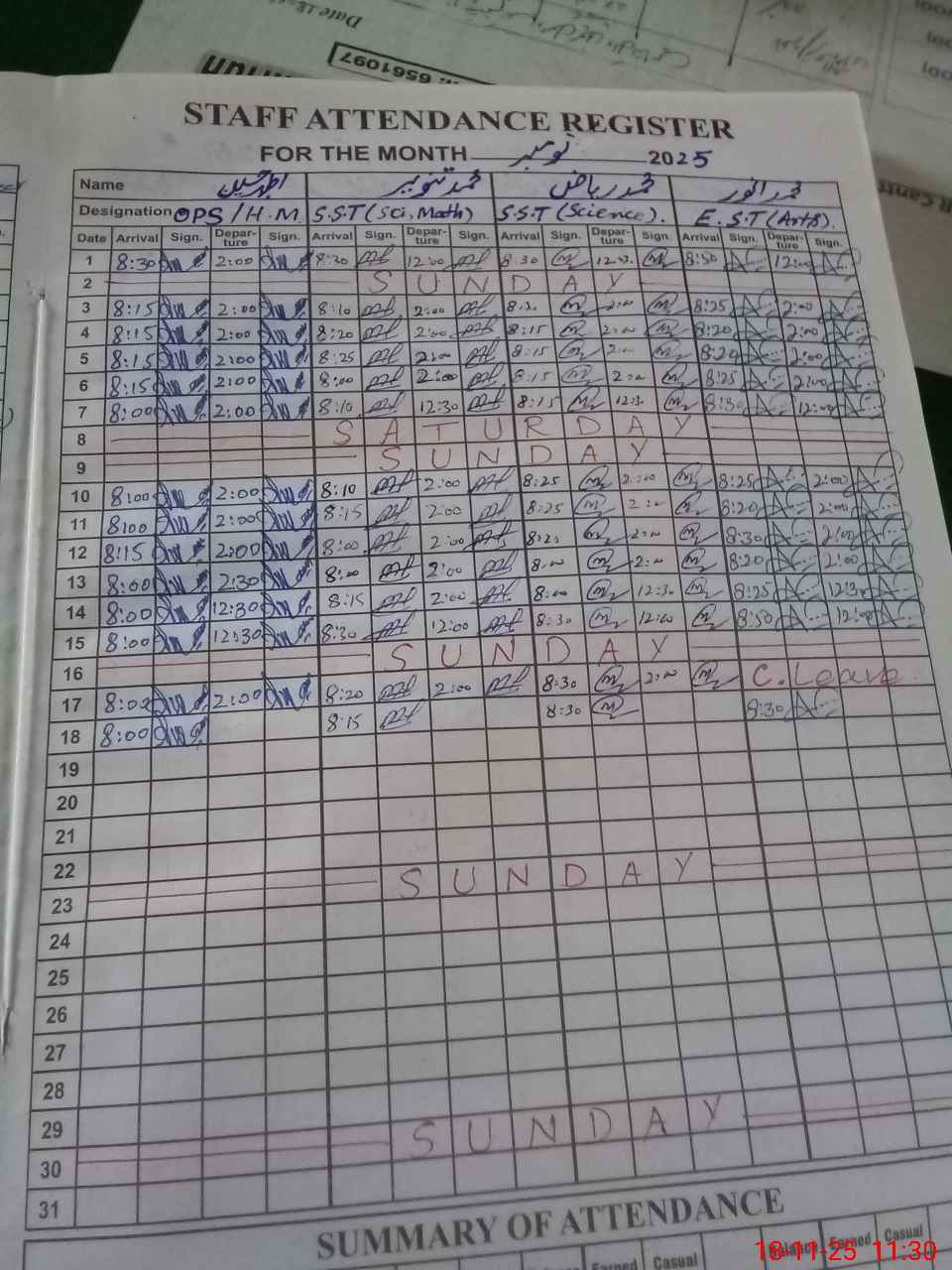 | CNIC | Full Name | Designation | R/C | Absence During Last Calender Month |