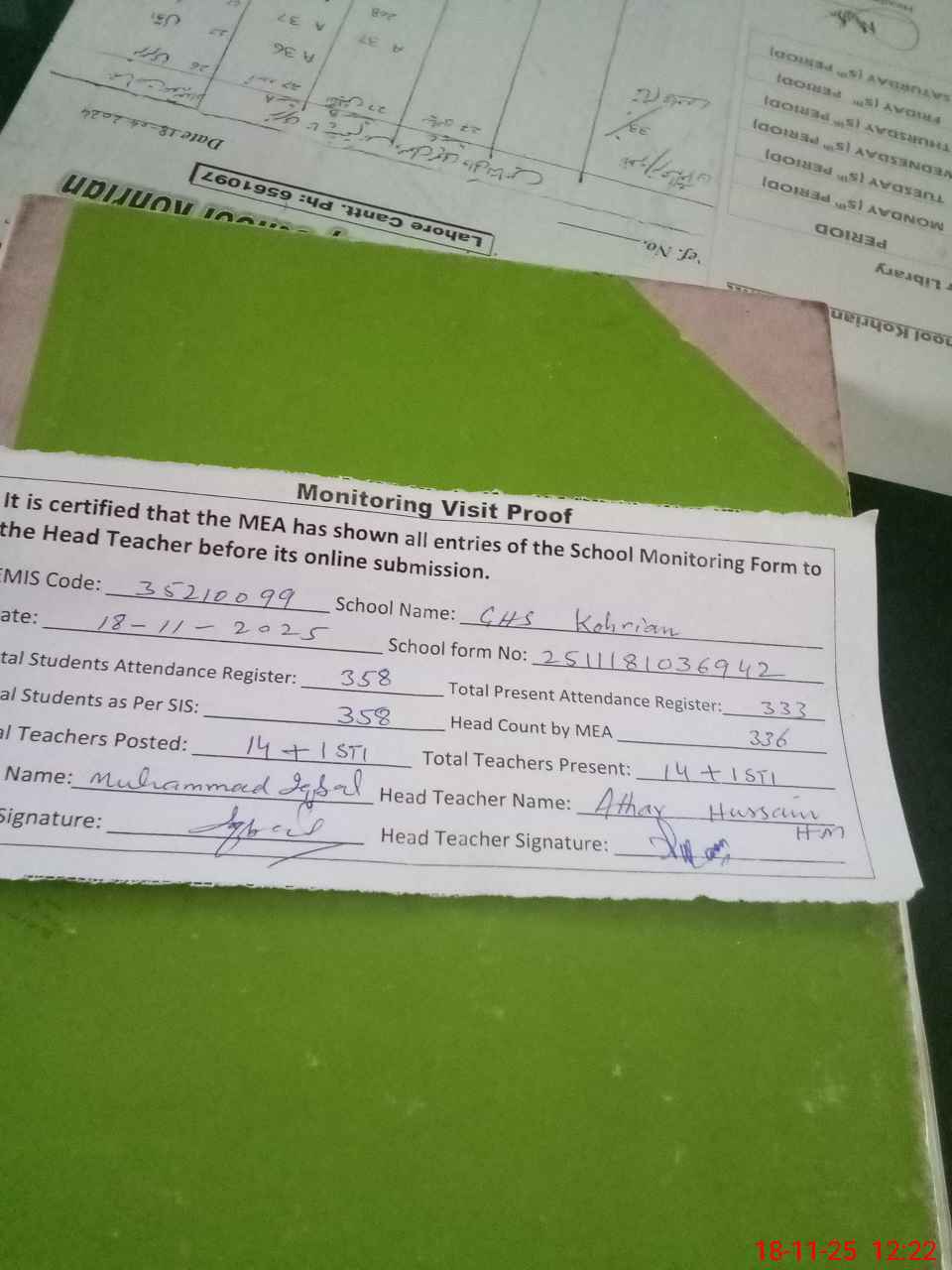 | Attendance Register | Head Teacher | MEA with School | Visit Proof |
