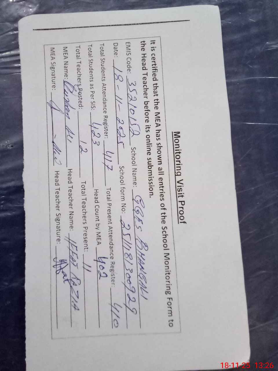 | Attendance Register | Head Teacher | MEA with School | Visit Proof |