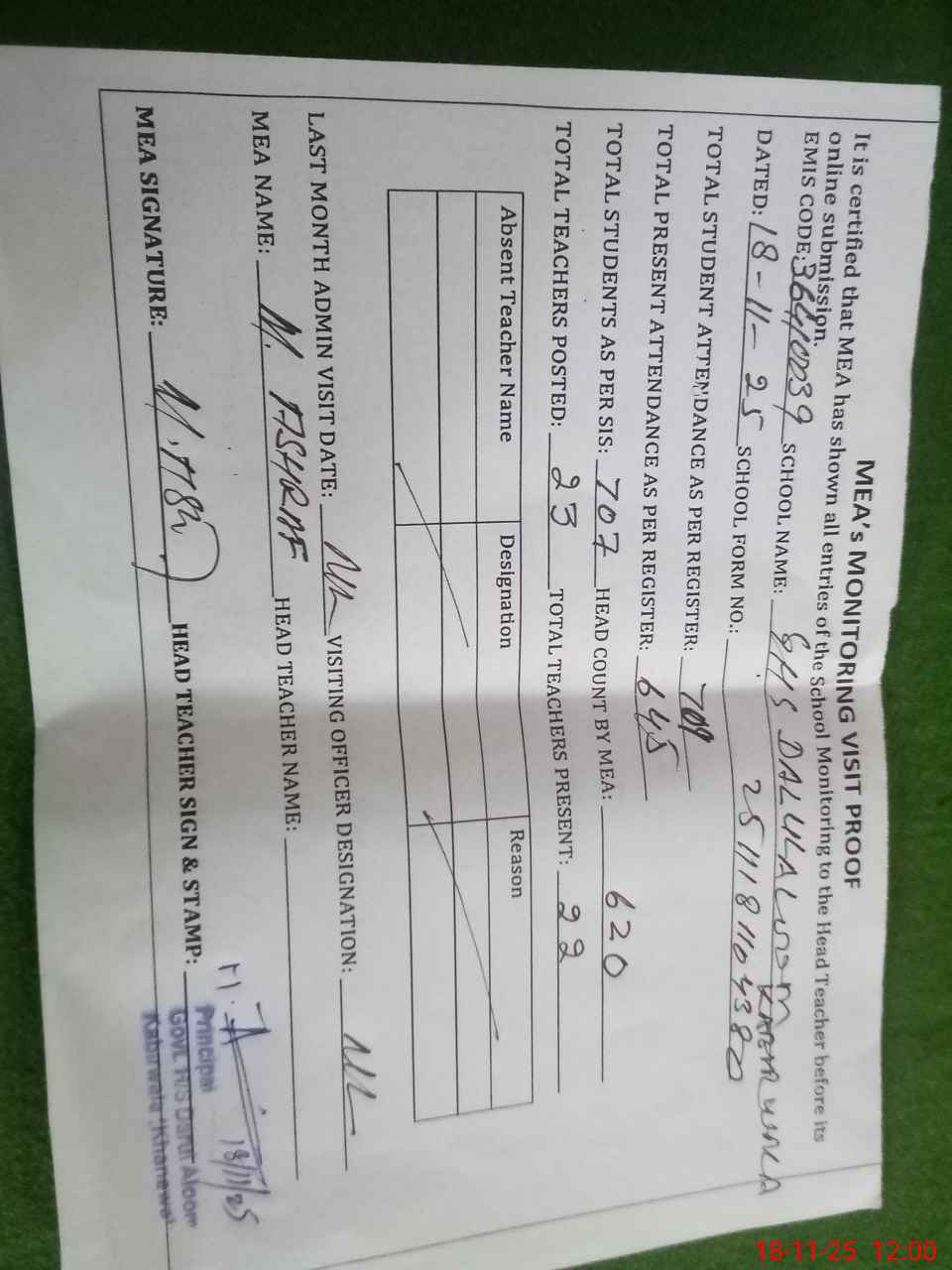 | Attendance Register | Head Teacher | MEA with School | Visit Proof |
