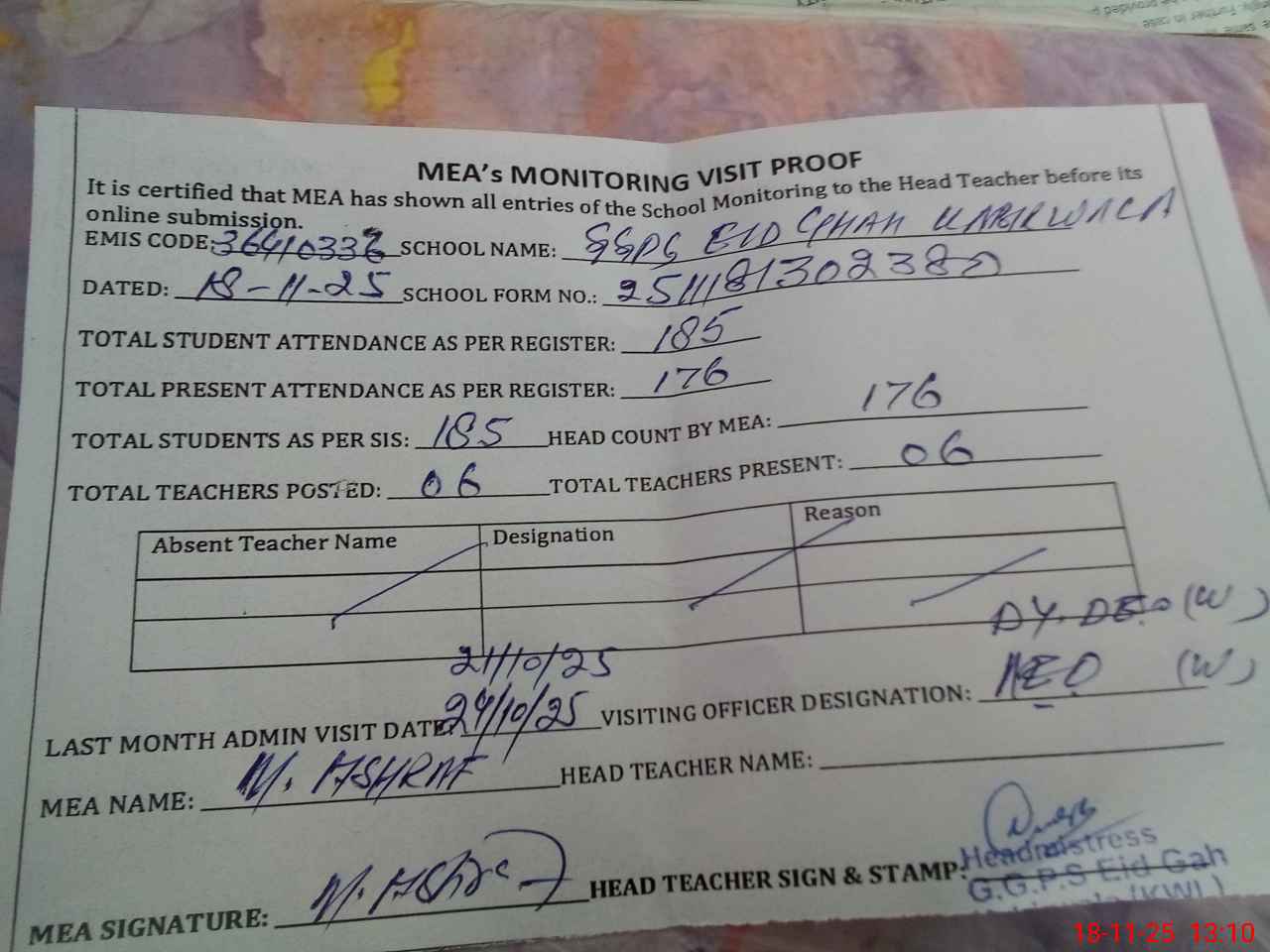 | Attendance Register | Head Teacher | MEA with School | Visit Proof |