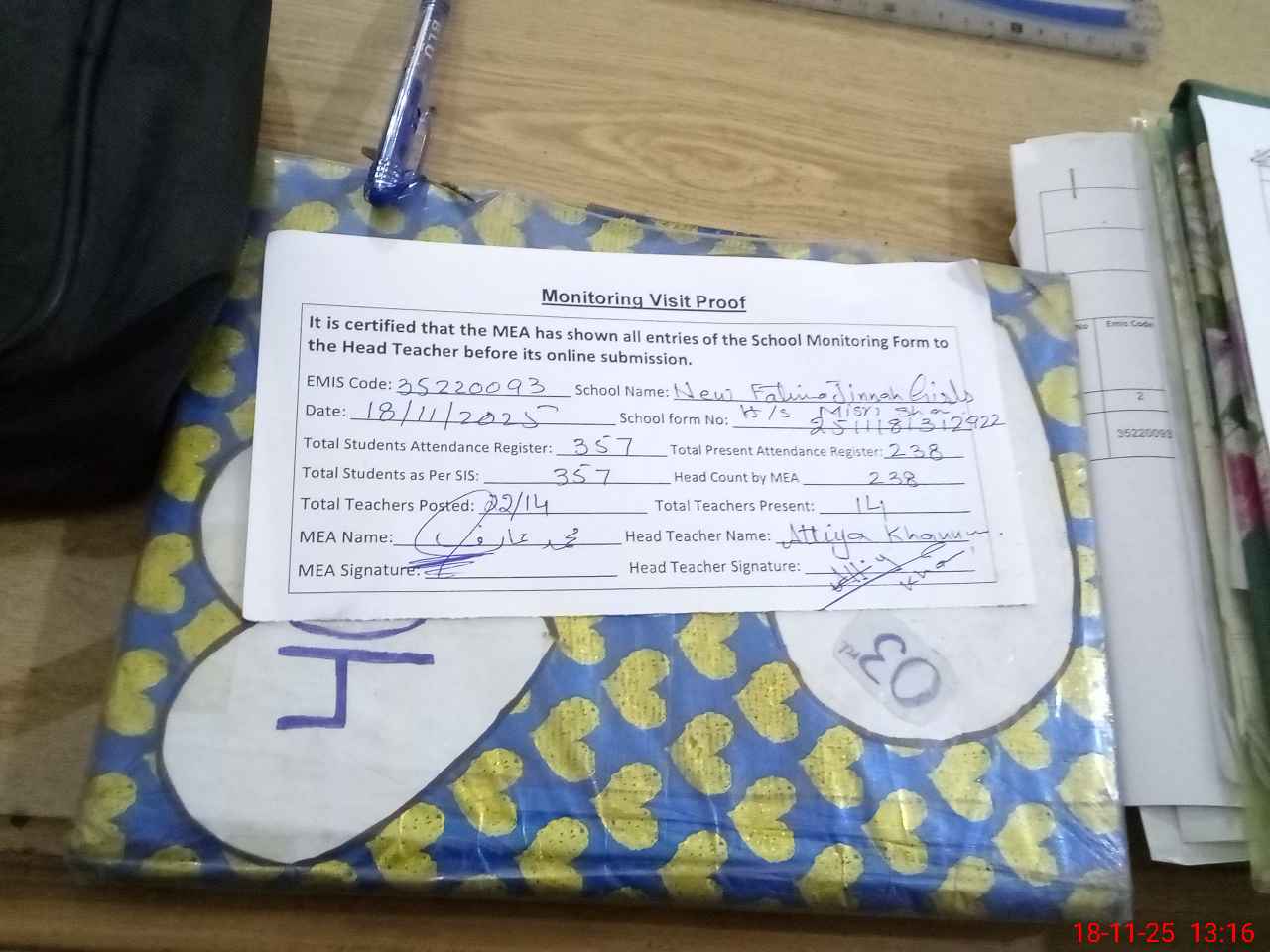 | Attendance Register | Head Teacher | MEA with School | Visit Proof |