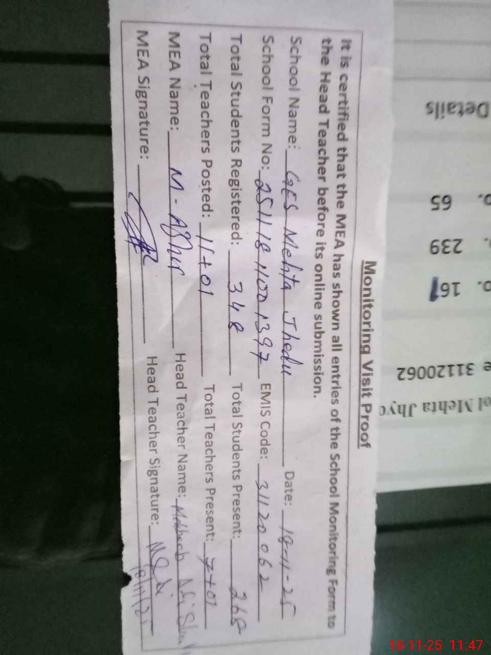 | Attendance Register | Head Teacher | MEA with School | Visit Proof |