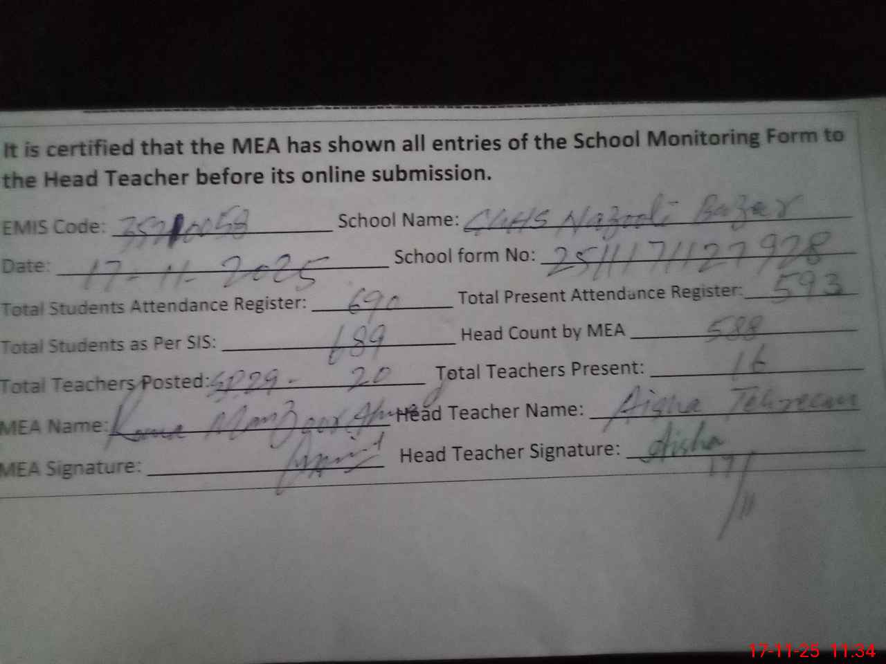 | Attendance Register | Head Teacher | MEA with School | Visit Proof |