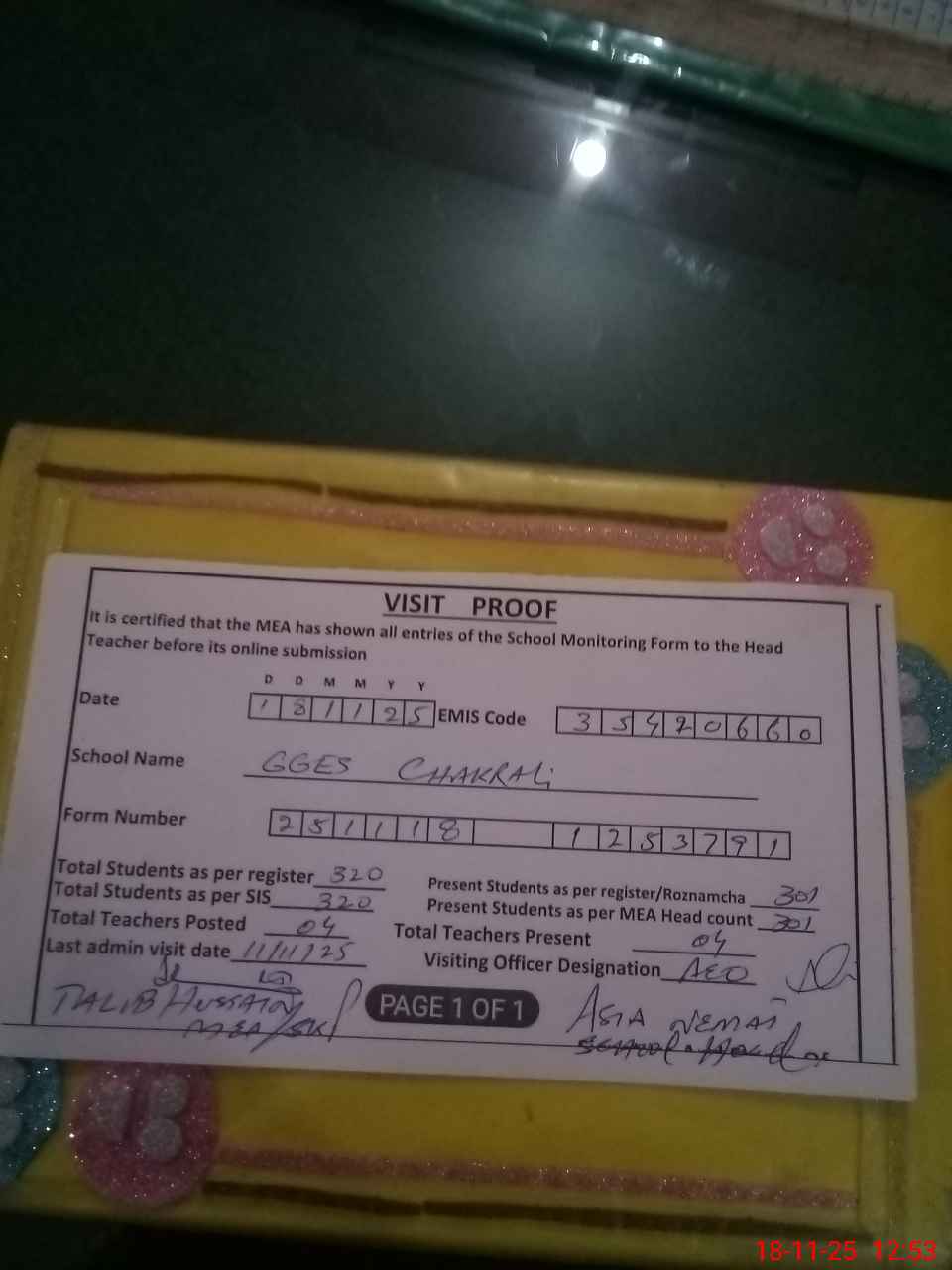 | Attendance Register | Head Teacher | MEA with School | Visit Proof |