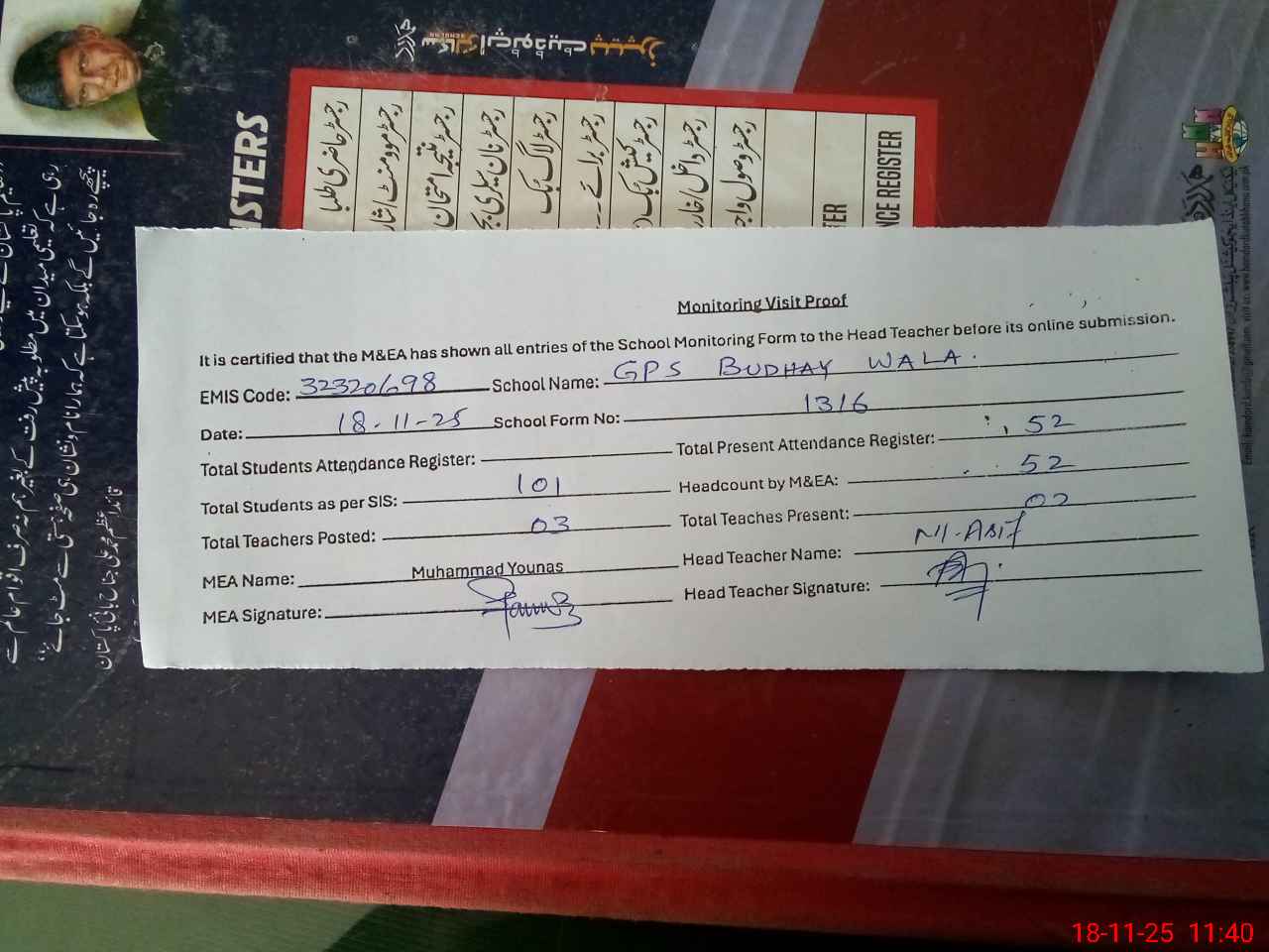 | Attendance Register | Head Teacher | MEA with School | Visit Proof |