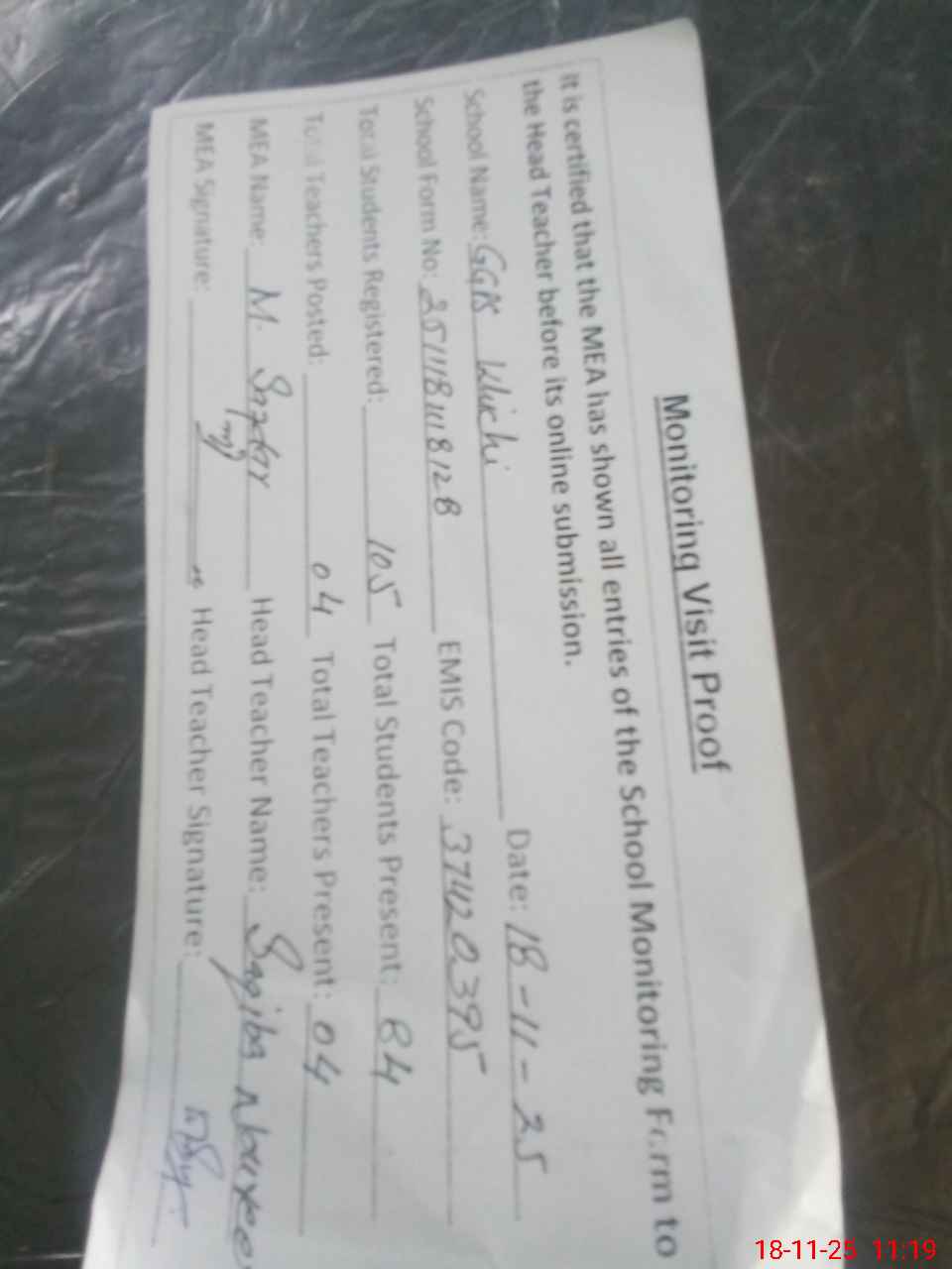 | Attendance Register | Head Teacher | MEA with School | Visit Proof |