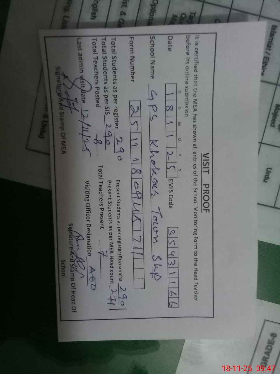 | EMIS Code: 35431166 | Name of School: GPS MC KHOKHAR TOWN | |||