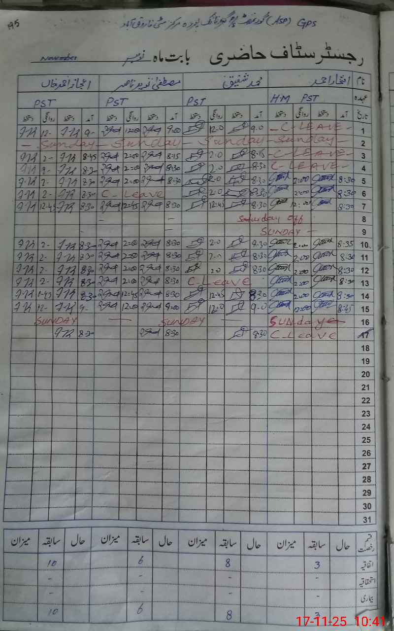 | CNIC | Full Name | Designation | R/C | Absence During Last Calender Month |