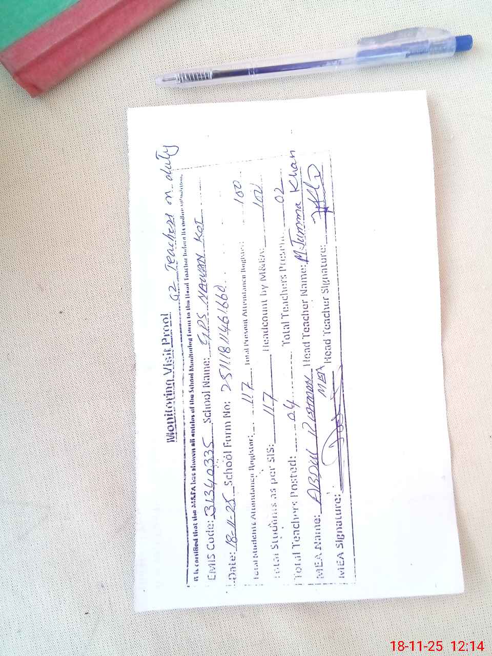 | Attendance Register | Head Teacher | MEA with School | Visit Proof |