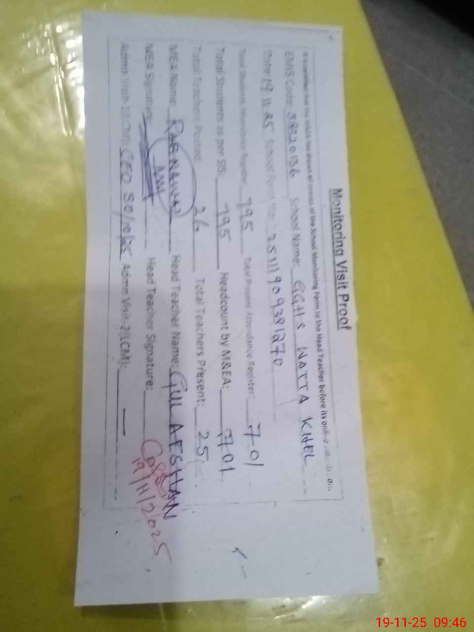 | Attendance Register | Head Teacher | MEA with School | Visit Proof |