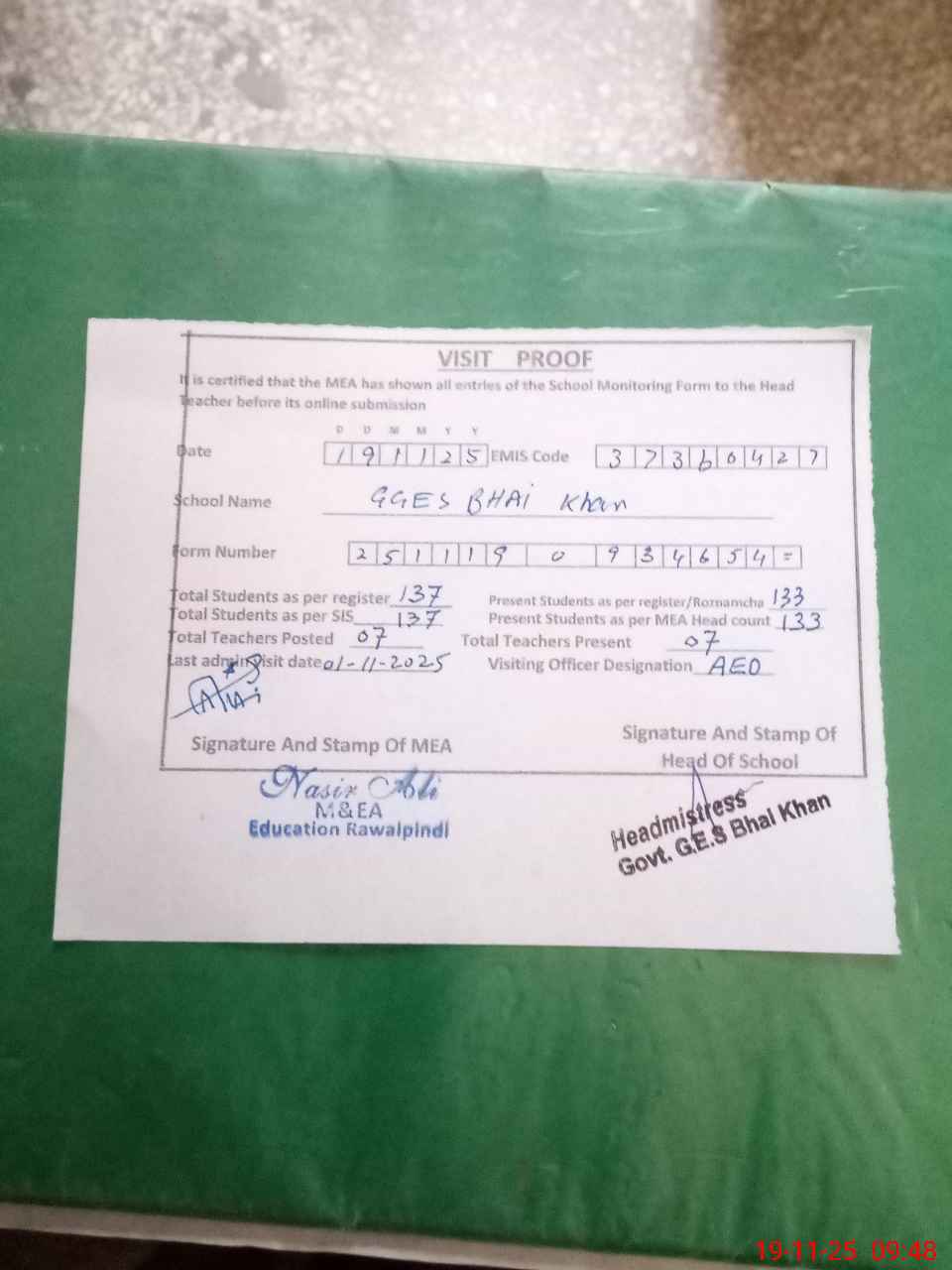 | Attendance Register | Head Teacher | MEA with School | Visit Proof |