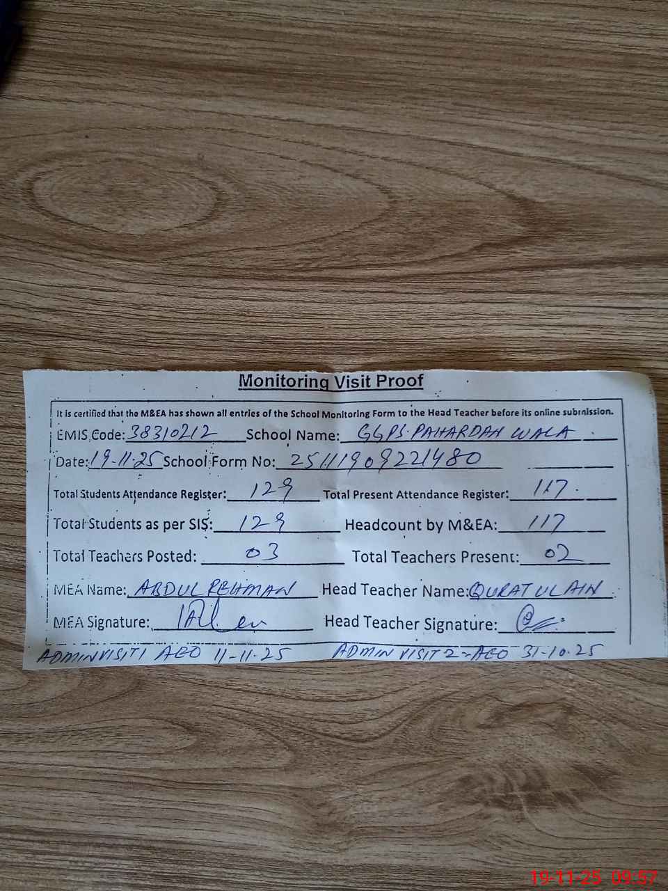 | Attendance Register | Head Teacher | MEA with School | Visit Proof |