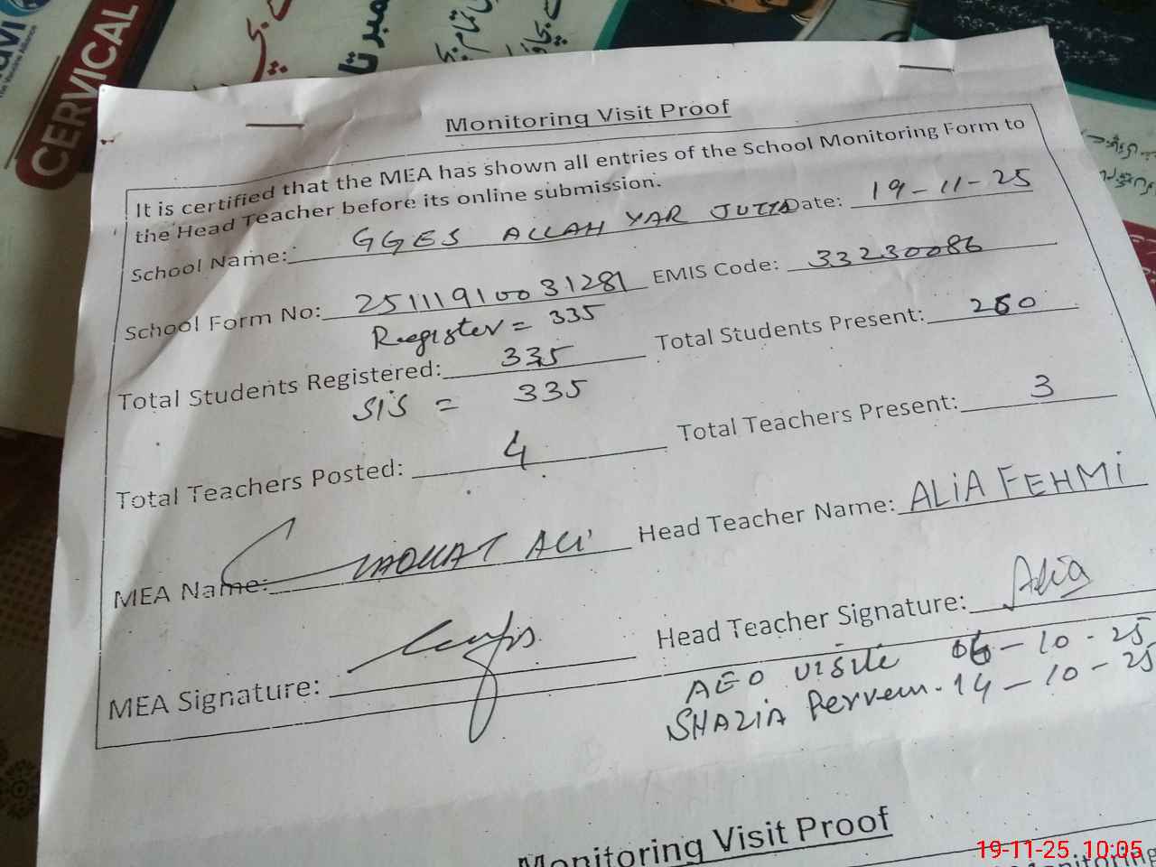 | Attendance Register | Head Teacher | MEA with School | Visit Proof |