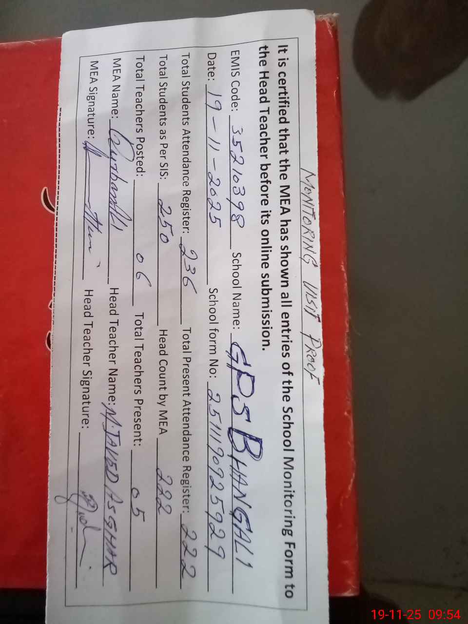 | Attendance Register | Head Teacher | MEA with School | Visit Proof |