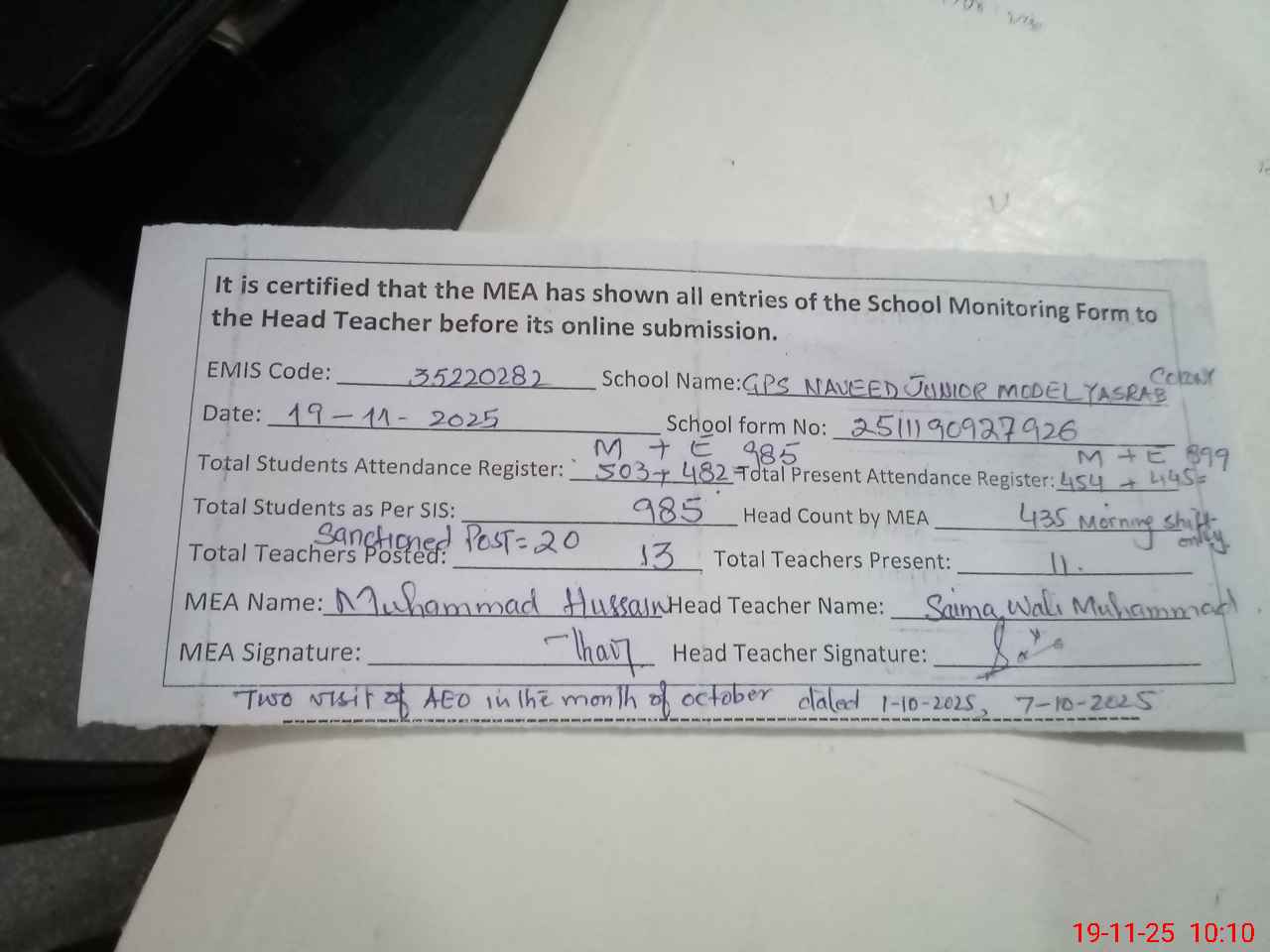 | Remarks (Use Separate Page if Required): 1 Two visit of AEO in the month of October 2025 dated 1st October 2025 and 7th October 2025 2 total 19 students difference roznamcha and head count | |||||