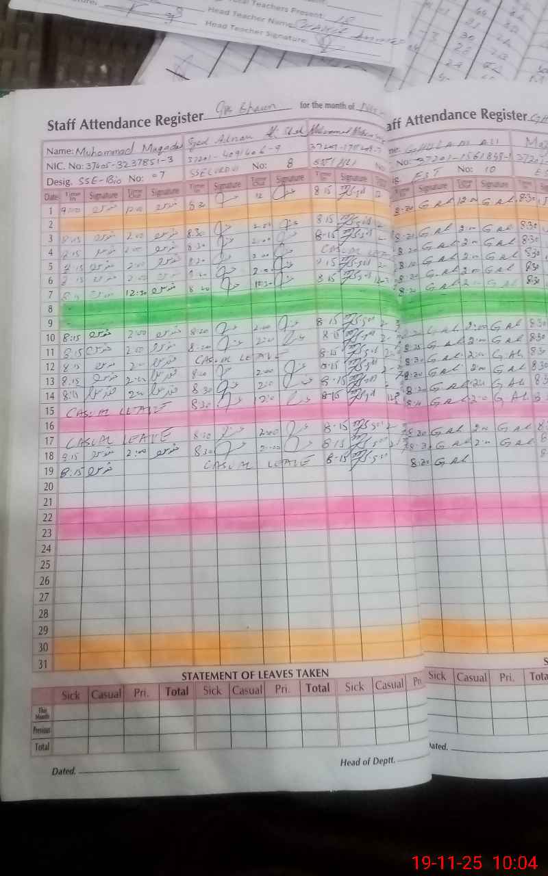 | CNIC | Full Name | Designation | R/C | Absence During Last Calender Month |