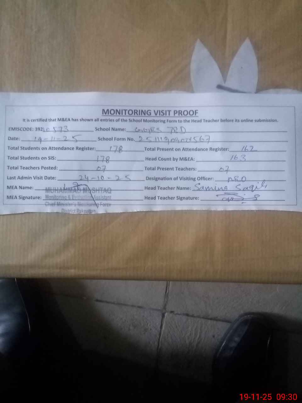 | Attendance Register | Head Teacher | MEA with School | Visit Proof |